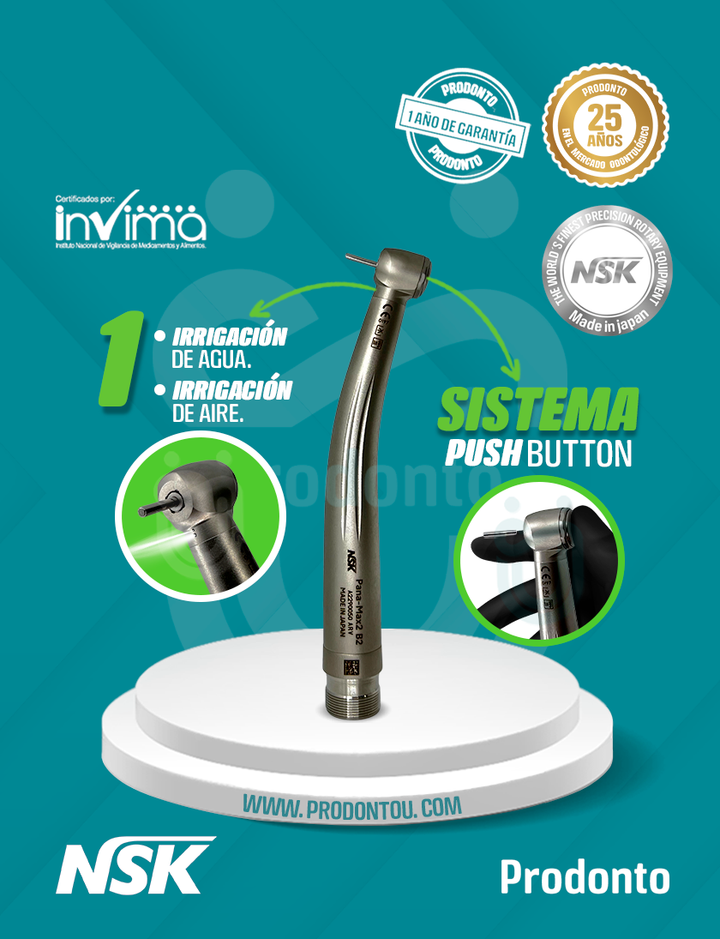 El Portafresas Push Botton es el mecanismo original NSK de pulsador que tensiona la empuñadura de la fresa durante la rotación. Permite insertar y extraer la fresa con un solo toque y sin herramientas.
