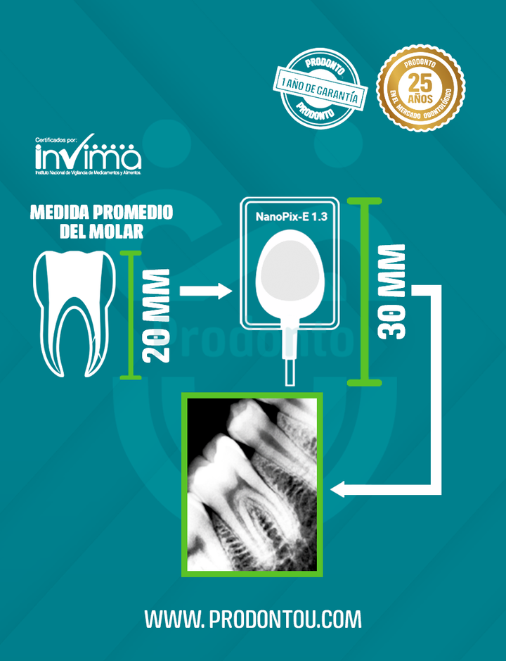 Área de Imagen Amplia: Con un área de imagen de 22,5 x 30 mm, el NanoPix-E 1.3 puede cubrir todo el molar en una sola toma. Esto proporciona más información clínica y facilita el diagnóstico preciso.